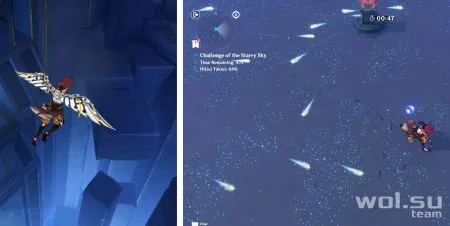 После головоломки с нажимной плитой вернитесь в предыдущую комнату и прыгните в воду. В начале испытания «Звездное небо» выпускаются сотни падающих звезд, от которых игроки Genshin Impact должны увернуться, чтобы победить. После того как вы десять раз попадете в цель, задание повторяется.